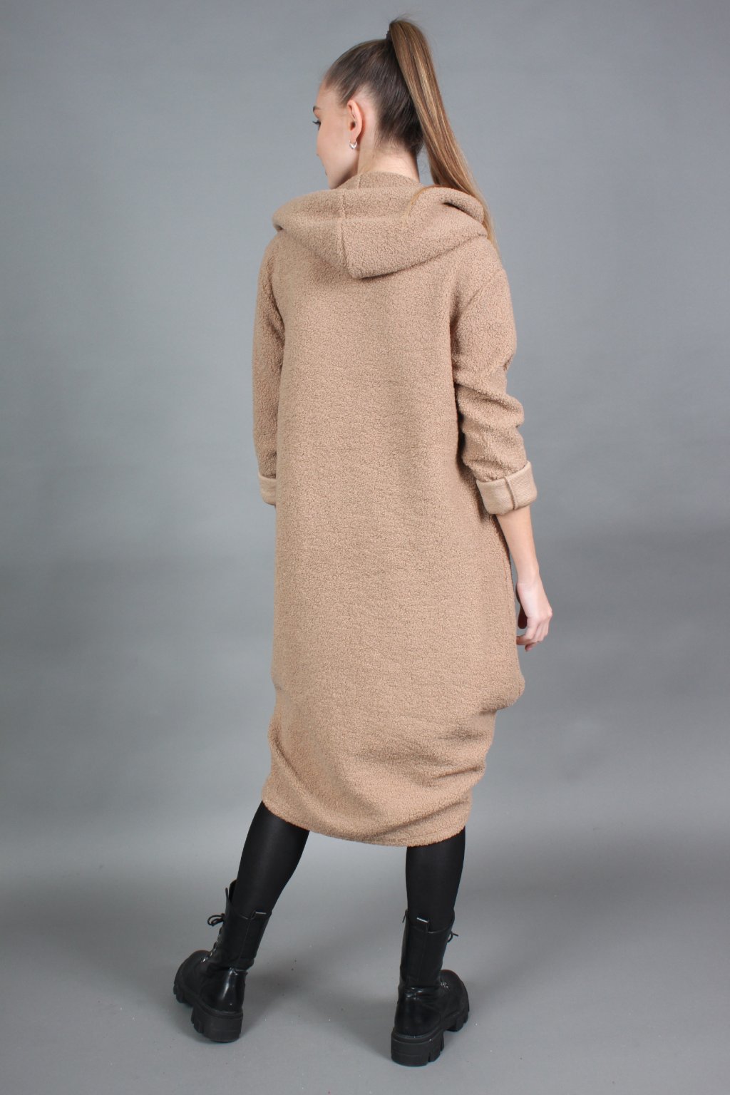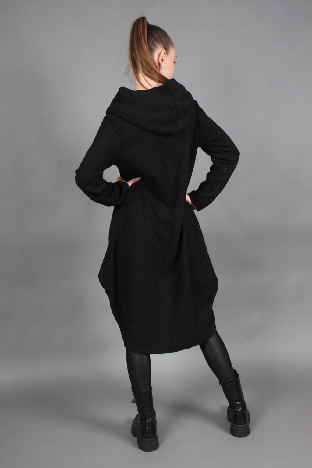 Dlouhá tunika s kapucí, na předním díle kapsy, zadní díl delší. Teplý a příjemný materiál. V různých barvách.