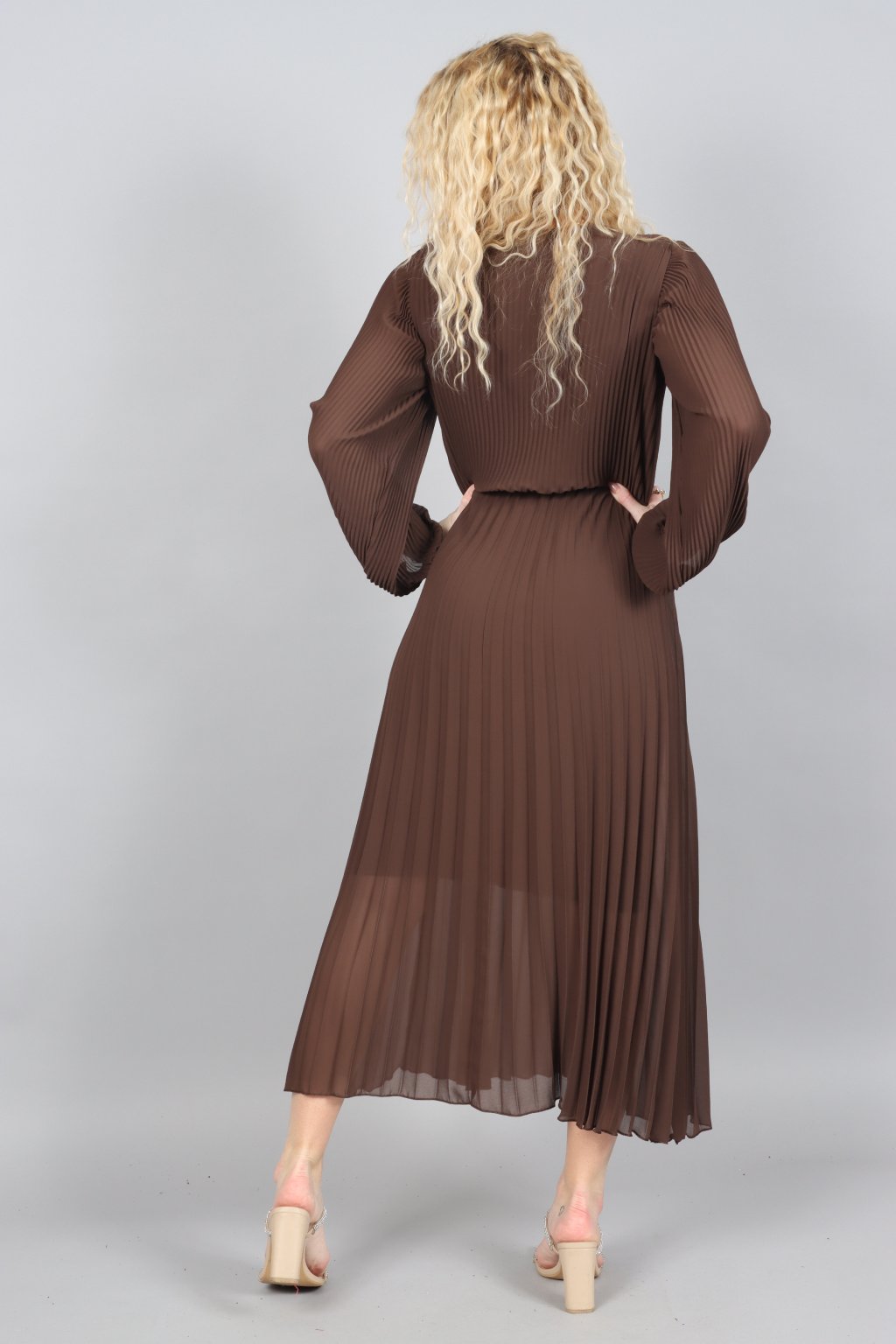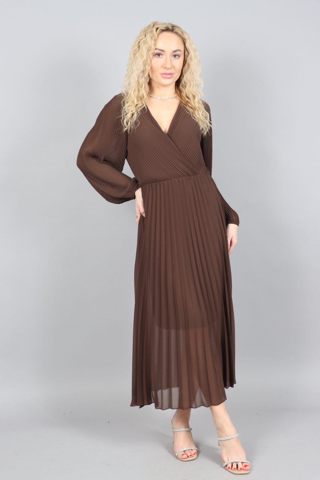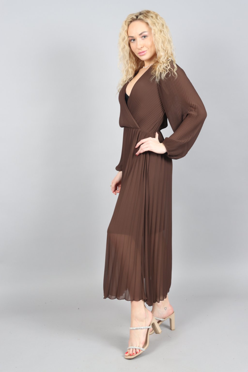 Dlouhé společenské šaty RŮŽA, překládaný výstřih do V, dlouhý rukáv a v pase na gumu. Celé šaty jsou plisované. Vhodné do společnosti.