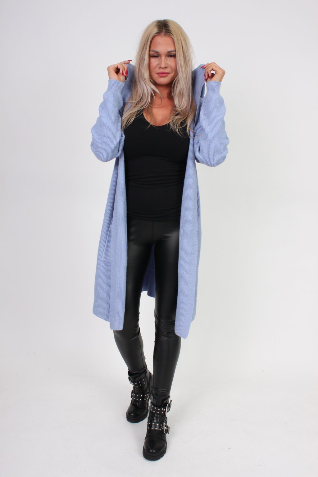 Příjemný a hřejivý dlouhý kardigan CALA s kapsami a kapucí. Modelka měří 168 cm a nosí velikost S/M.