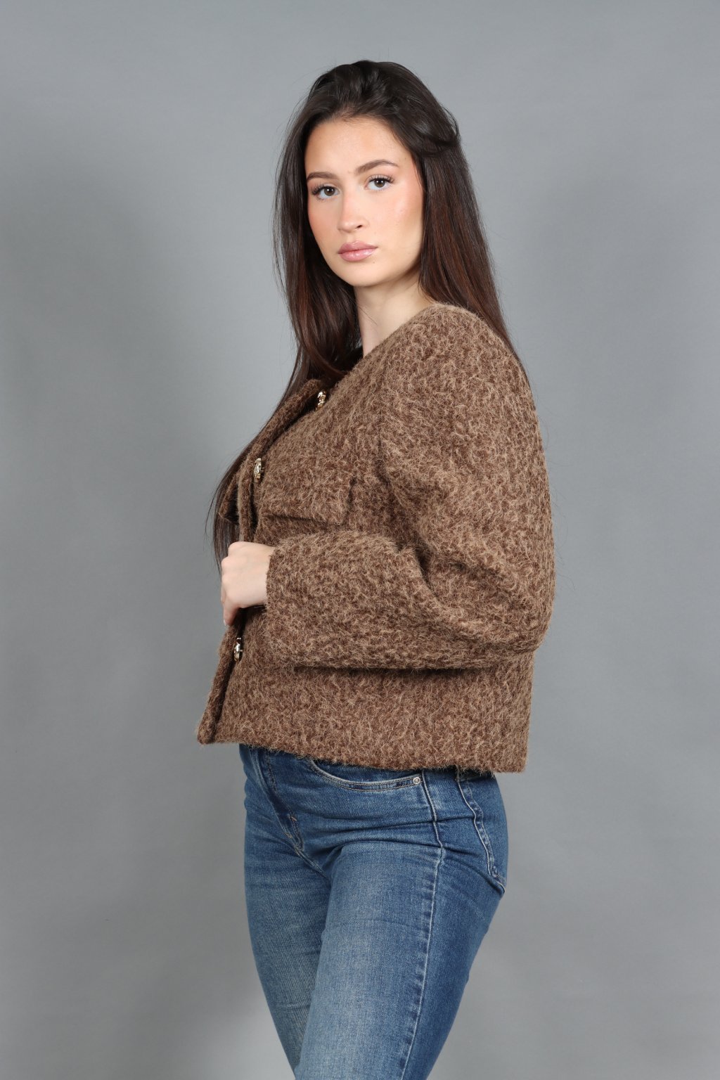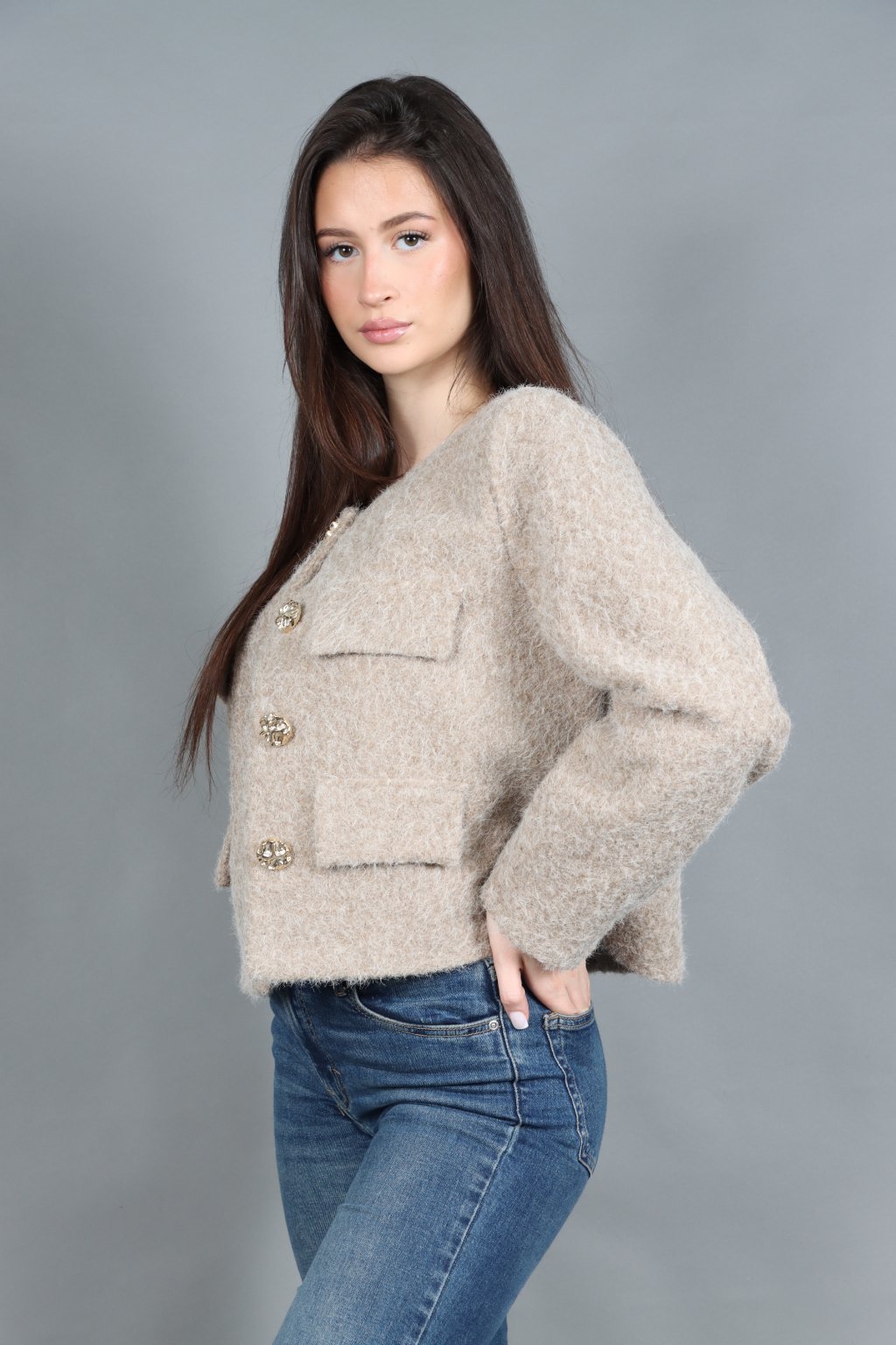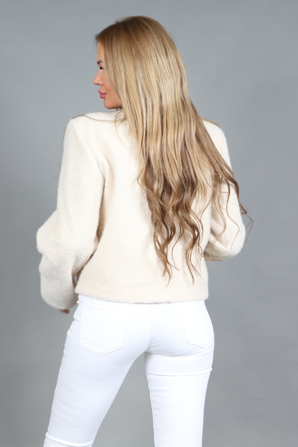 Tohle sako je přesně ten typ, který vypadá luxusně už na první pohled. Je měkké, příjemné na dotek a díky své „chlupaté“ textuře působí moderně, žensky a zároveň opravdu hřejivě.
