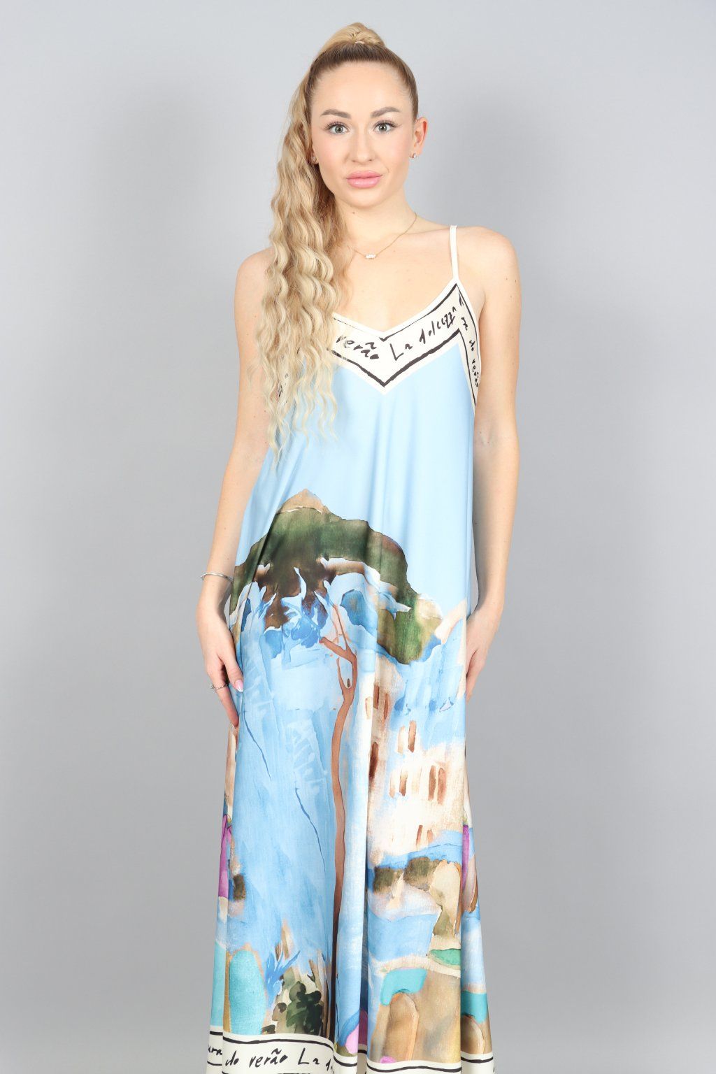 - Špagetová ramínka a výstřih do V krásně odhalí klíční kosti a prodlouží siluetu
