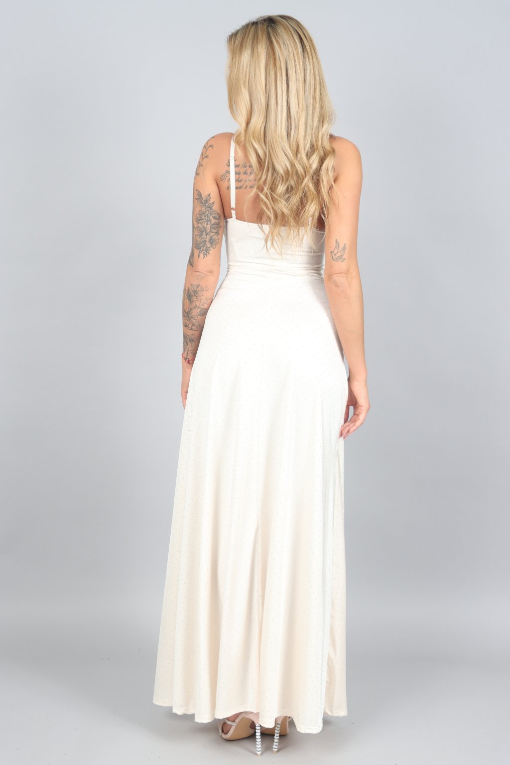 Dlouhé společenské šaty MARGIT dokonale kombinují ženský střih, pohodlí a jemný třpyt, který na světle krásně vynikne.