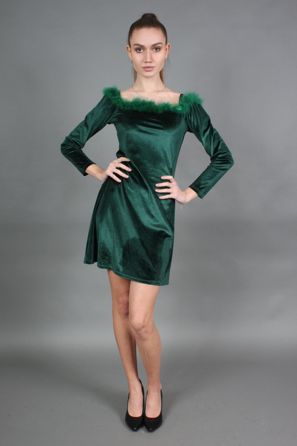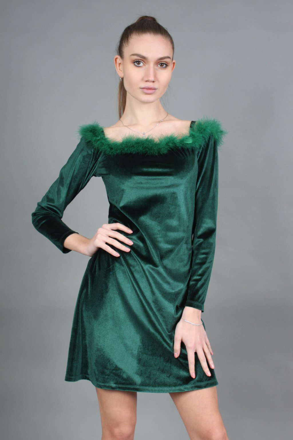Sametové šaty s lodičkovým výstřihem lemovaným boa, dlouhý rukáv, mini délky.