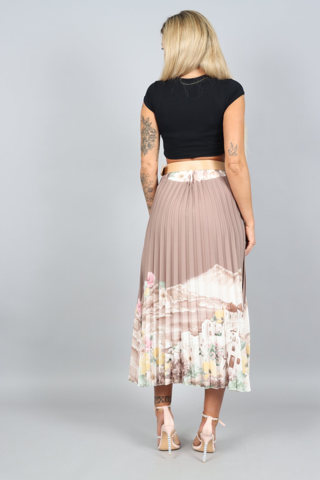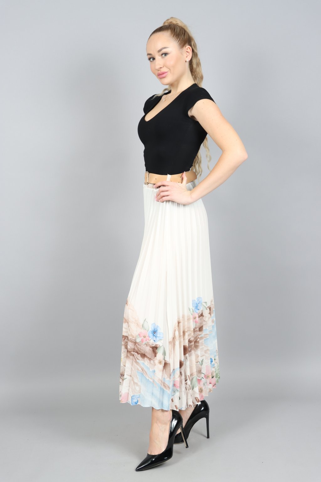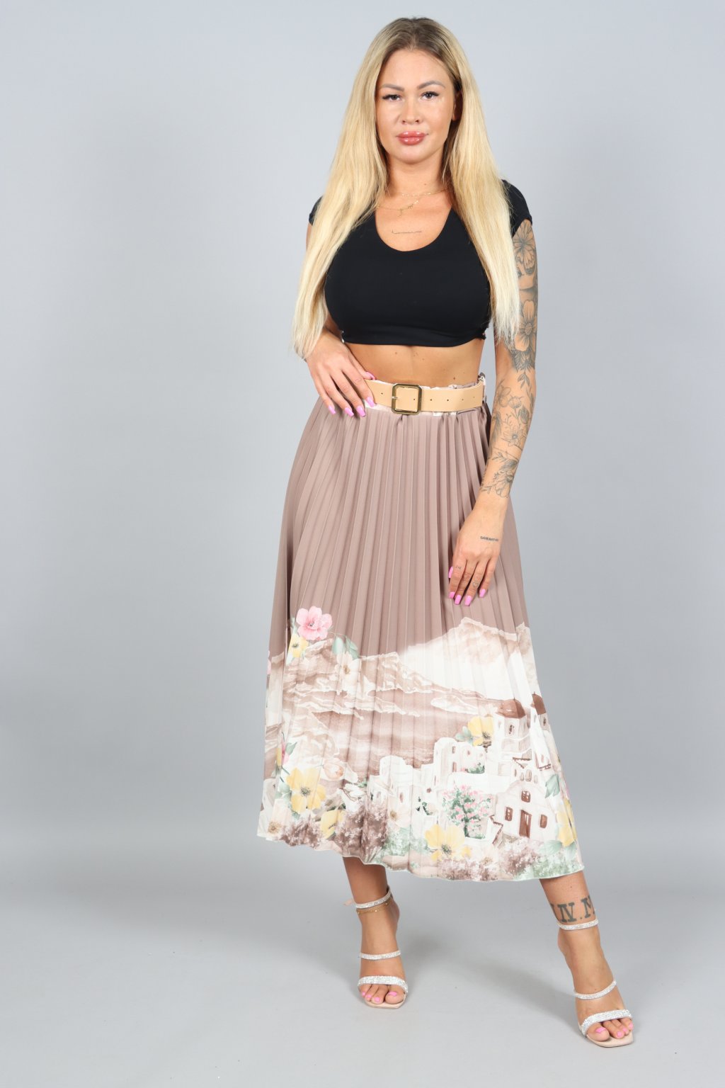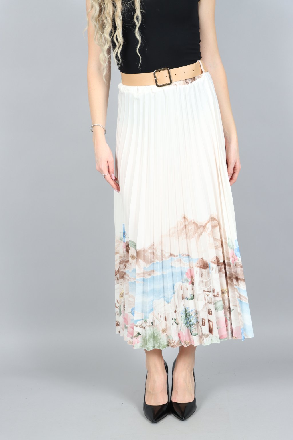 Vzdušná, jemná a přitom nepřehlédnutelná. Tahle plisovaná sukně ARABELA v sobě nese atmosféru letního večera u moře – pastelové tóny, romantický motiv a pohyb, který působí elegantně při každém kroku.