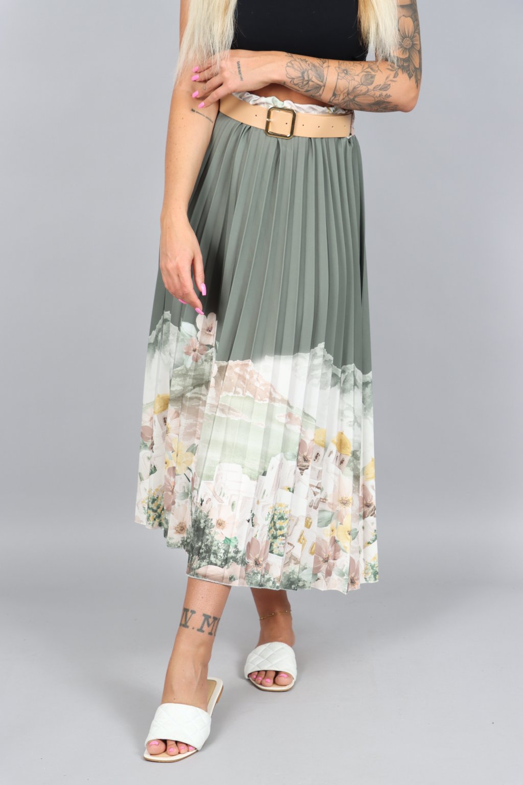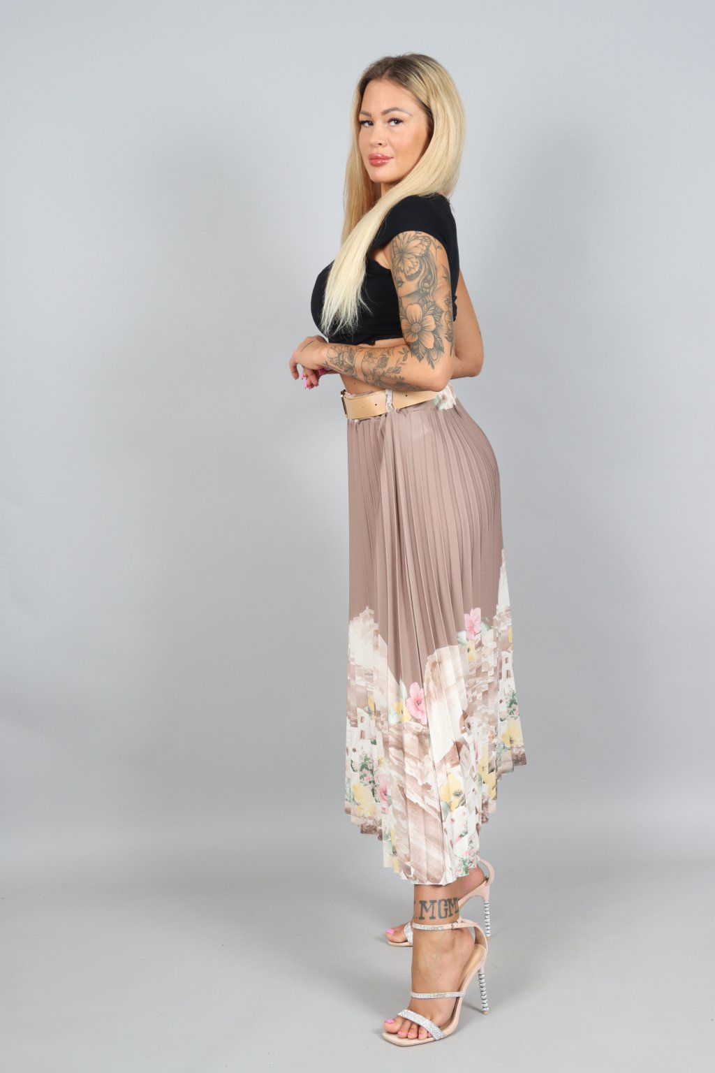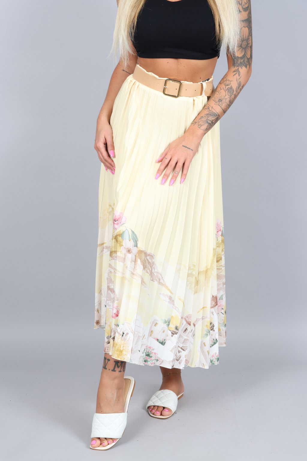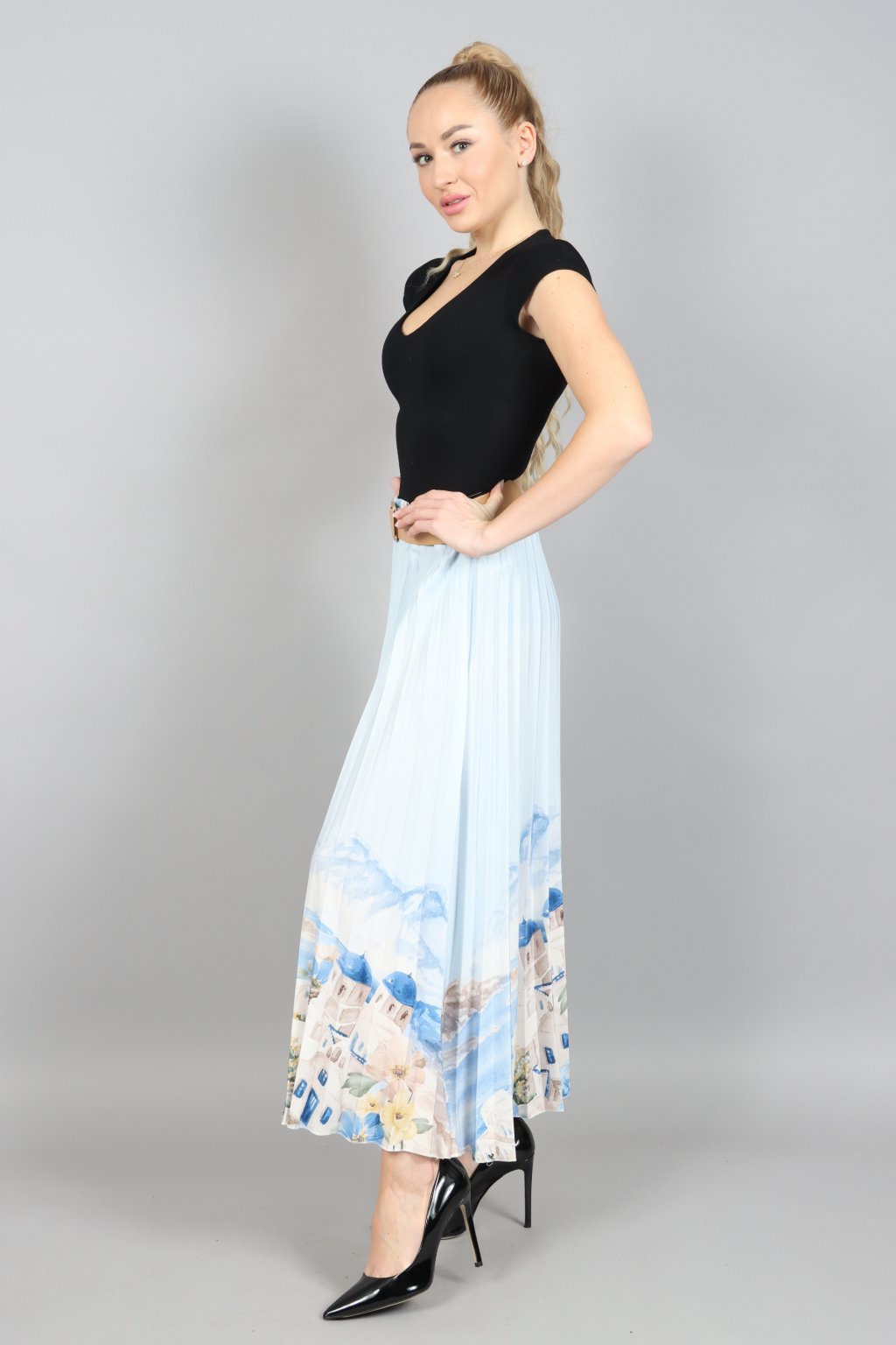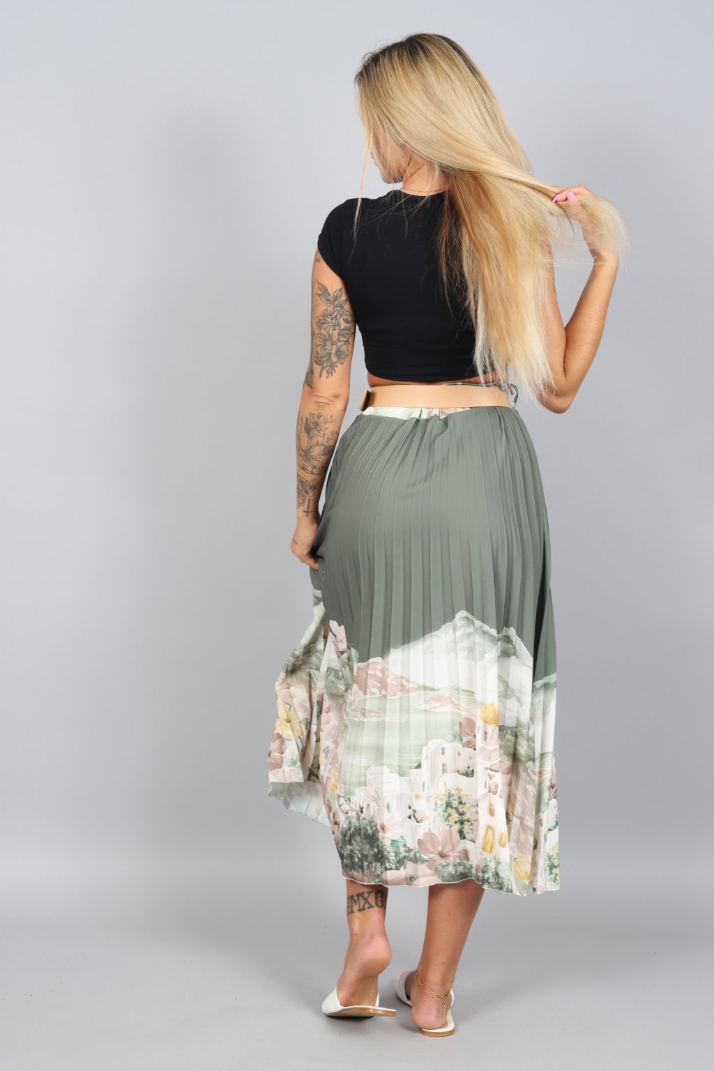Vzdušná, jemná a přitom nepřehlédnutelná. Tahle plisovaná sukně ARABELA v sobě nese atmosféru letního večera u moře – pastelové tóny, romantický motiv a pohyb, který působí elegantně při každém kroku.