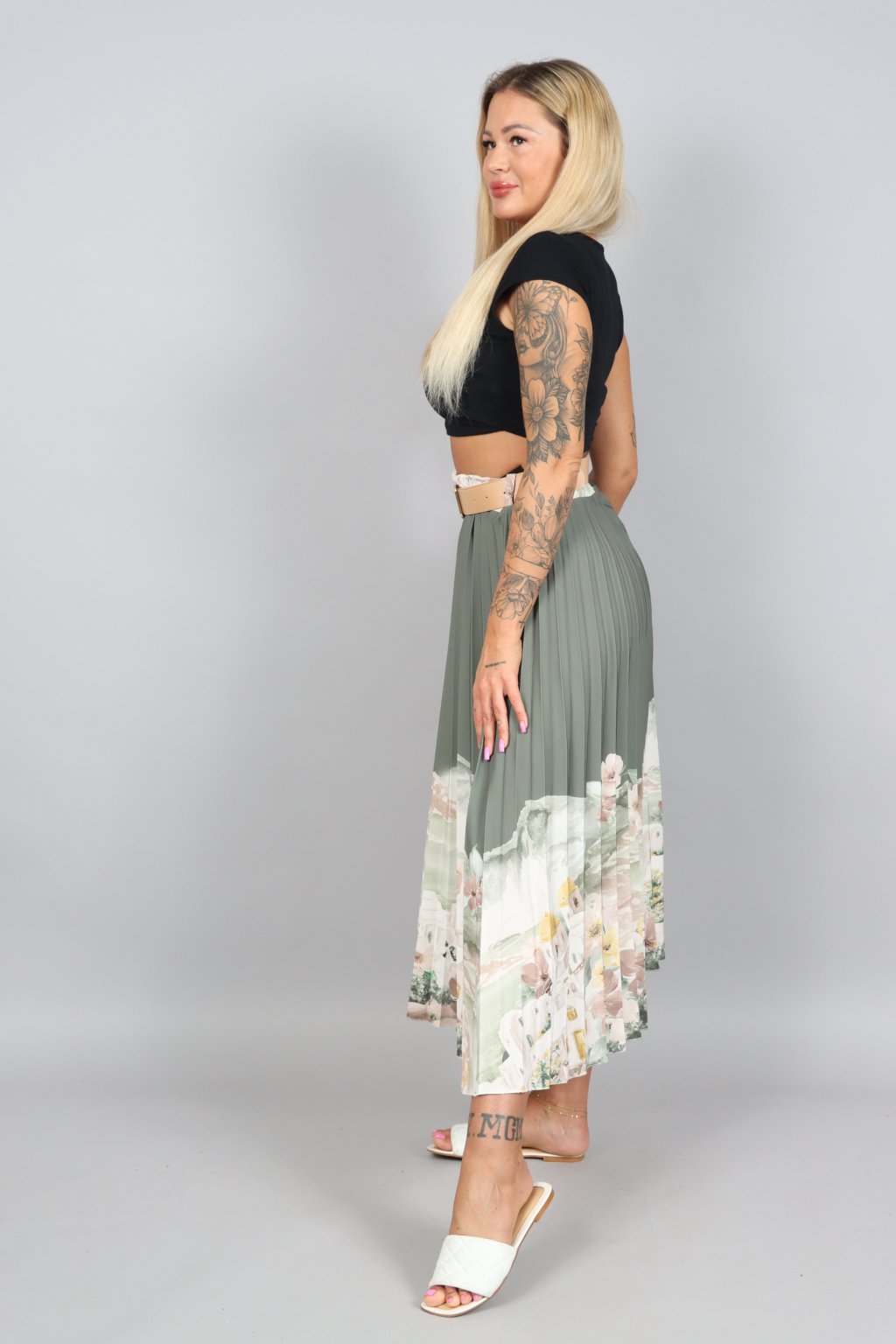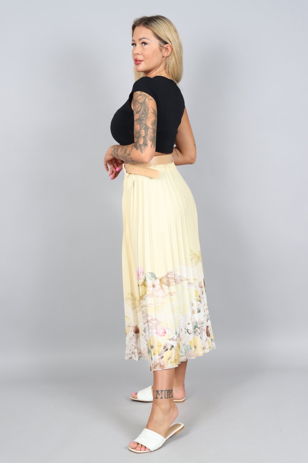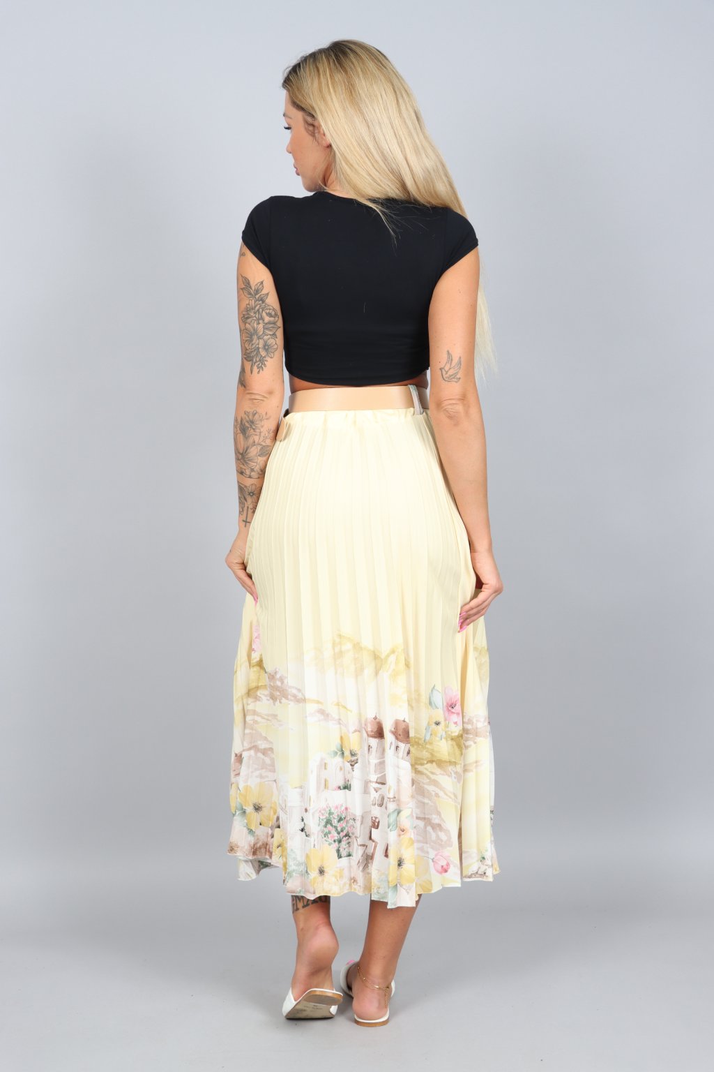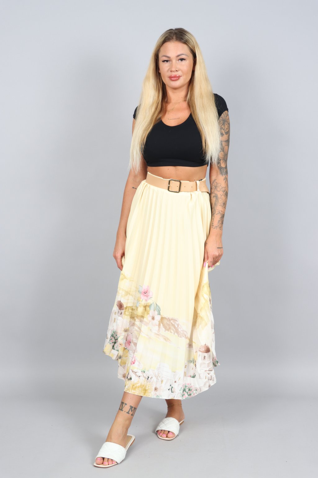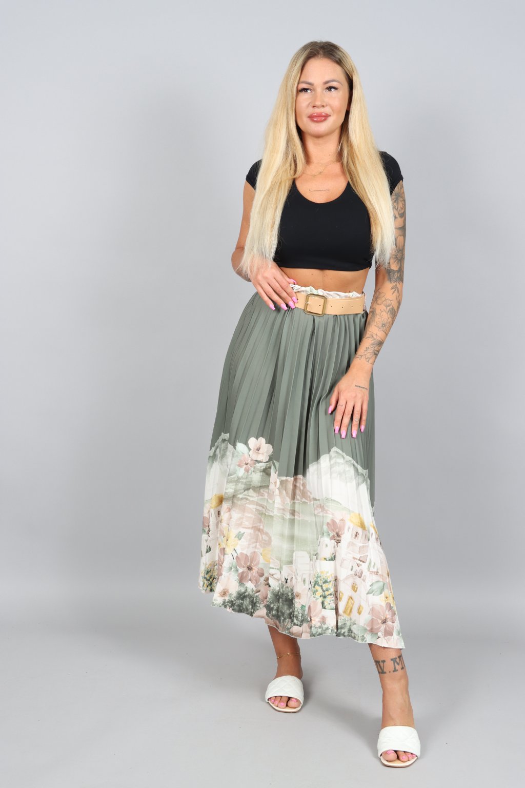 Vzdušná, jemná a přitom nepřehlédnutelná. Tahle plisovaná sukně ARABELA v sobě nese atmosféru letního večera u moře – pastelové tóny, romantický motiv a pohyb, který působí elegantně při každém kroku.