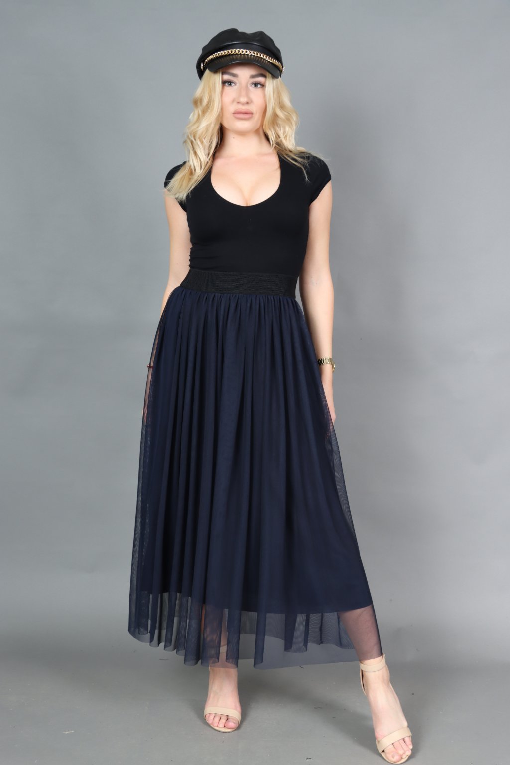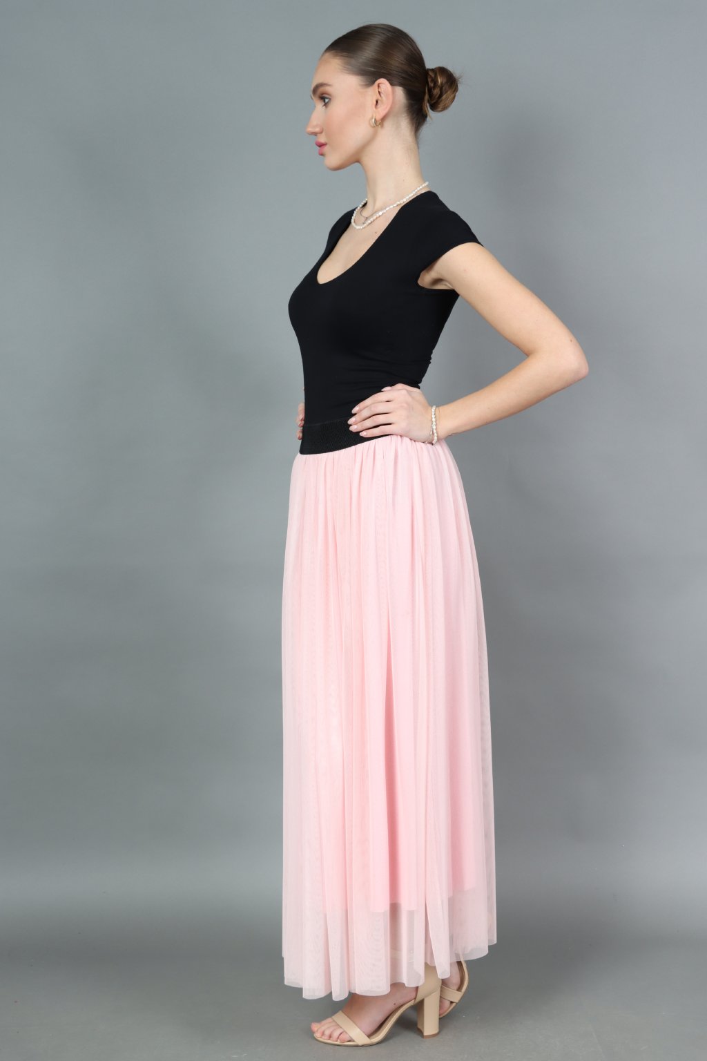 Dlouhá tylová sukně s elastickým pasem na gumu a podšívkou.