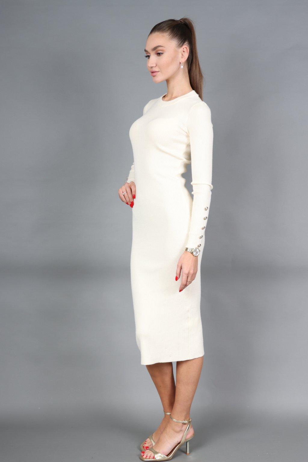 Příjemný hřejivý úplet s vysokým podílem viskózy, malý kulatý výstřih a minimalistický střih bez rozparků jsou ideální kombinace pro milovnice krásy v jednoduchosti. Nikdo však nepřehlédne ozdobné zlaté knoflíčky podél loktu na obou rukávech, které dodávají šatům jemný dotek luxusu.